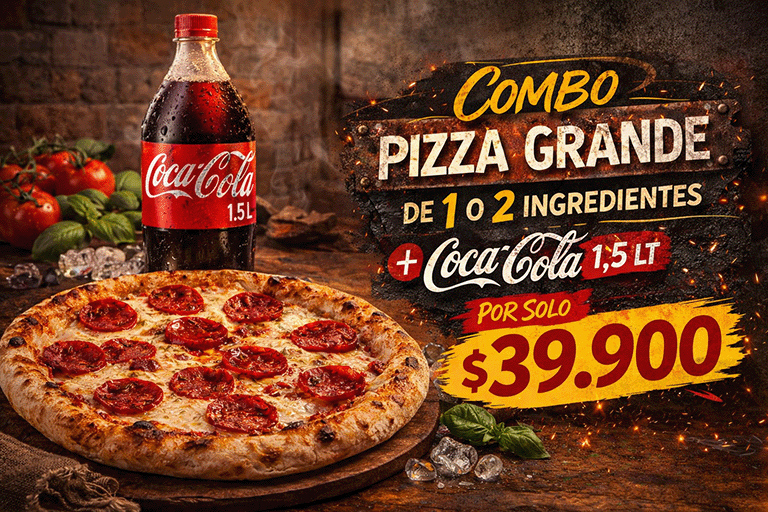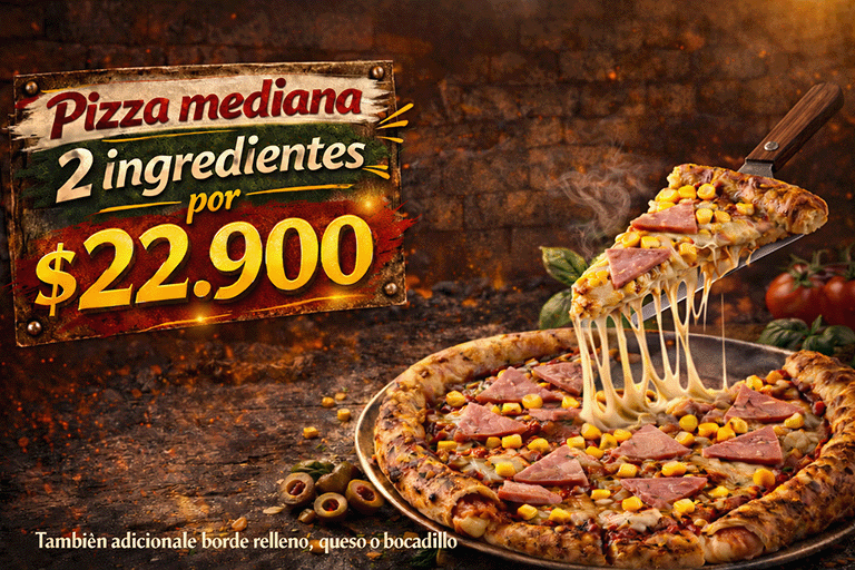 Salsa Pietre’s Original + Queso 100% Mozzarella + Carne molida al horno + Pollo en cubos parrillado + Bacon Ahumado + Chorizo Colombiano.